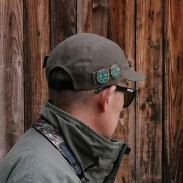 右サイドには狩猟者紀章(狩猟者バッジ)を2個装着可能なバッジベルトを装備。ホールにはブラックニッケルのアイレットで補強して耐久性とシャープなビジュアルを得ました。キャップ本体に穴を開けていないのでバッジのピンが頭に響いて痛くなることもありません。